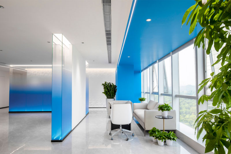 藍色散發(fā)出理性、包容與思考,暗含著公司對品質(zhì)的追求,將公司的“創(chuàng)新、科技、便捷”的理念流露在空間之中。