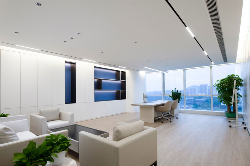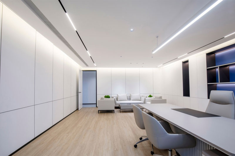 總裁辦整體空間體塊分明,大面積的木飾面體現(xiàn)出品質(zhì)和細節(jié),藍白的色調(diào)與空間功能的巧妙搭配,輕盈的空間蕩漾著優(yōu)美的旋律感。
