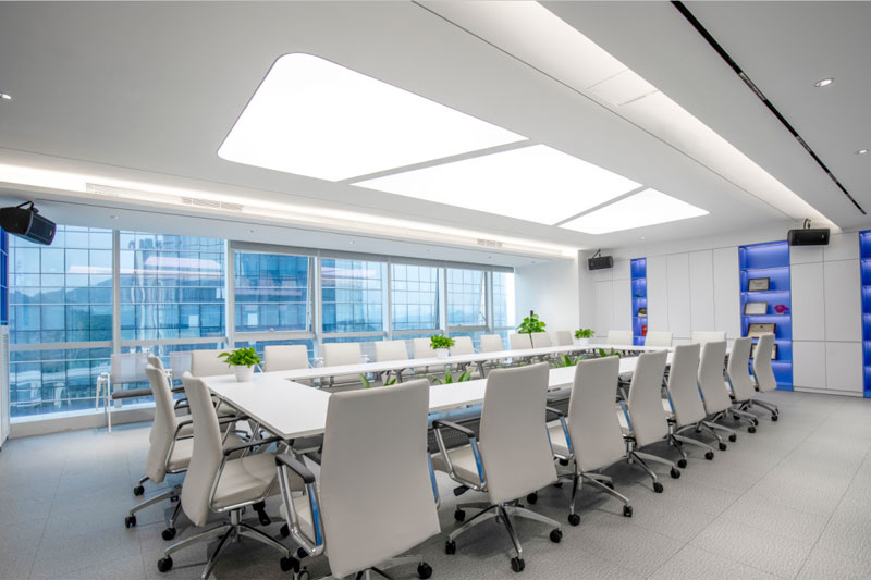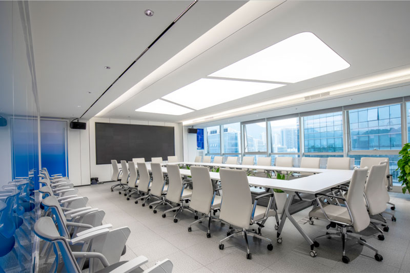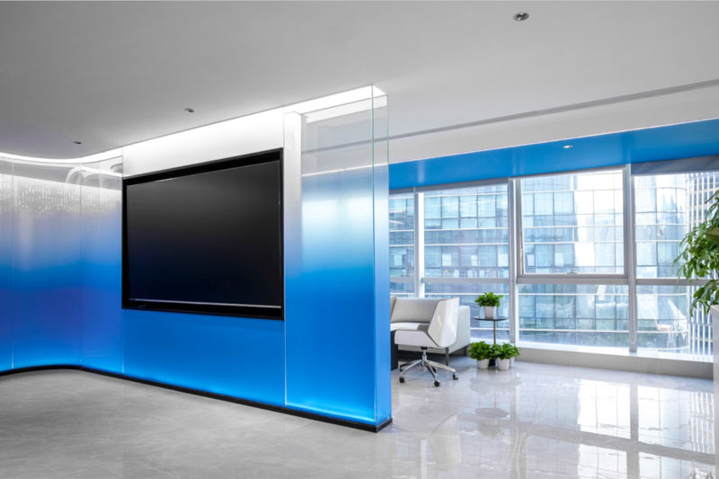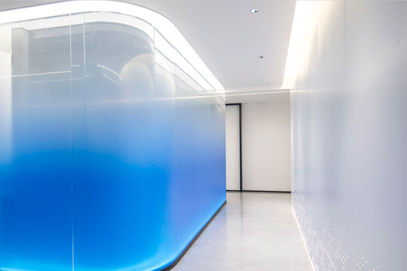 大小會議室都延續(xù)了空間的藍色基調(diào),利用通透的藍色玻璃分隔過道,使空間更加通透明亮,不僅讓視感增強,也深刻的加強了品牌形象在訪客心中的作用。