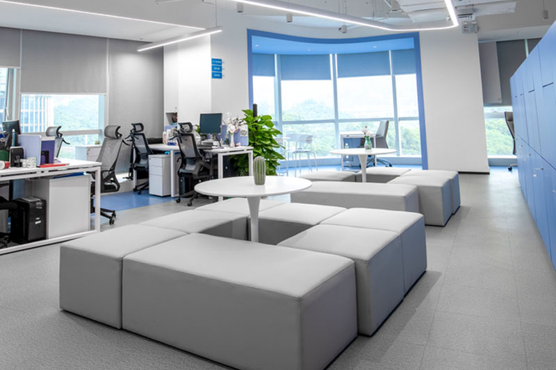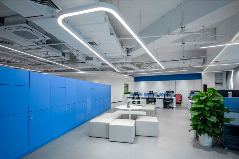為了體現(xiàn)客戶的品牌形象和影響力,設(shè)計師將“創(chuàng)新、科技、便捷”的理念融入到空間的每個環(huán)節(jié),從企業(yè)的VI色中提取出藍色運用到整體空間中。