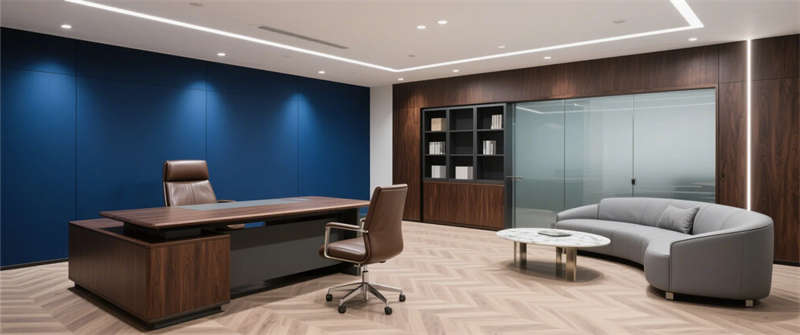 總裁辦公室:人字拼木地板與深胡桃木家具提升質(zhì)感,深藍(lán)藝術(shù)漆背景墻強化品牌識別;
