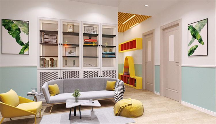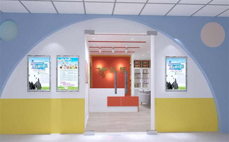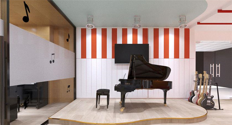 前廳不變的情況下,logo背景墻色調偏重,所以運用了色彩降噪,添加了一些偏冷色調,不僅能夠提升整個空間的舒適感,還能給孩子一個安全、放松的空間。結合了logo的主色調,再進行色彩搭配可以形成歡快、親切、活潑的色彩氛圍。與此同時還設置了也增加了兩間鋼琴室,提高了空間利用率。大廳玻璃教室內墻面貼了吸音板,一方面體現(xiàn)機構在音樂上的專業(yè)性,另一方面就是讓空間的隔音效果做到最佳,讓孩子在學習的時候不受干擾,能夠安靜的學習。