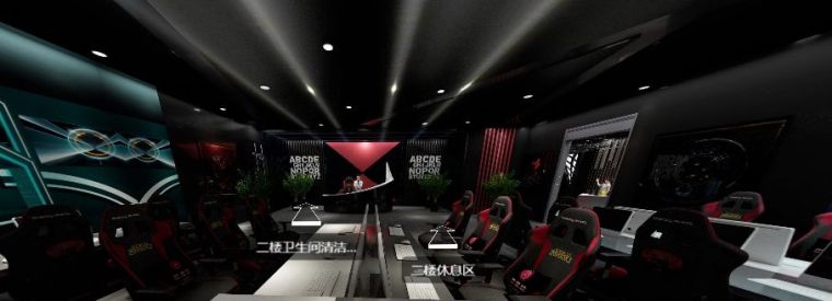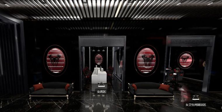 在迎賓區(qū)兩邊,左右分布著男賓區(qū)和女賓區(qū)。相較于普通網(wǎng)咖設(shè)計(jì),電競(jìng)會(huì)館具有賽事承辦上的專業(yè)特色,為了使人更加有比賽所需專注,男賓區(qū)墻面只有簡(jiǎn)單的涂鴉,飾物元素也極少,相較于男賓區(qū)設(shè)計(jì)較為簡(jiǎn)單,女賓區(qū)“紅蜘蛛”主題感十足,頂墻燈光合理搭配來(lái)減少黑色來(lái)的的壓抑感。男女獨(dú)立衛(wèi)生間分別分布在兩個(gè)區(qū)域,非常人性化。