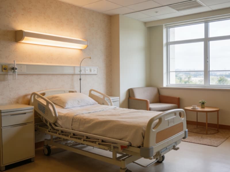 病房區(qū)摒棄冷硬色調(diào),墻面覆以柔和肌理的壁紙,病床旁設(shè)置可調(diào)節(jié)的柔光系統(tǒng),獨立觀景窗引入外部綠意,每間病房配備小型休憩角,讓陪護者也能獲得舒適體驗。