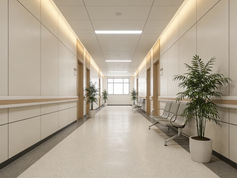 門診大廳以淺木色與純凈白為基調(diào),挑高空間搭配懸浮式吊頂,自然光透過大面積落地窗灑入,與室內(nèi)精心布置的景觀綠植呼應,消解患者的緊張感。分診臺采用弧形設(shè)計,圓角處理的臺面與溫潤的材質(zhì)傳遞出細膩關(guān)懷。