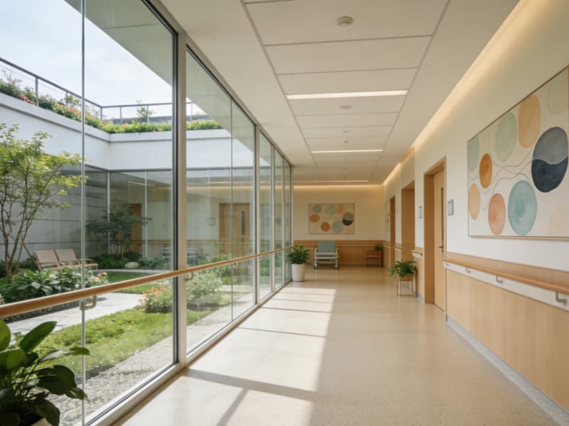 康復區(qū)與屋頂花園相連,通透的玻璃隔斷讓自然光線充分進入,地面采用防滑且富有彈性的材質(zhì),墻面懸掛療愈系畫作,患者可在此享受陽光與綠植的雙重滋養(yǎng)。