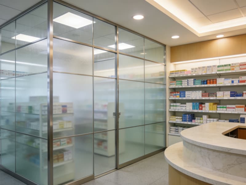 藥房采用半通透的玻璃隔斷,內(nèi)部陳設(shè)整齊有序,取藥臺高度貼合人體工學,溫和的燈光讓藥品陳列既清晰又不刺眼。