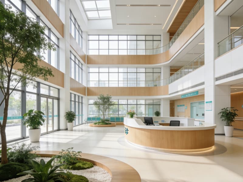 本設(shè)計以“療愈共生”為核心理念,為合肥這座綜合醫(yī)院構(gòu)建兼具功能性與溫度的空間。外觀采用柔和的曲線與淺米色石材,搭配錯落的玻璃開窗,打破傳統(tǒng)醫(yī)療建筑的刻板印象,墻面局部嵌入垂直綠植帶,讓自然氣息從建筑表皮便開始滲透。