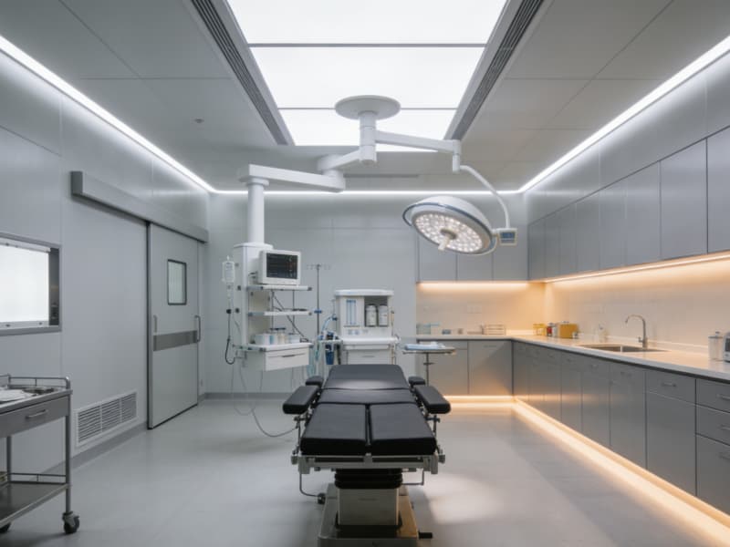 手術(shù)室區(qū)域以潔凈的灰白色為主,搭配暗藏式燈帶與防菌墻面,動線設(shè)計清晰流暢,確保高效運作的同時,通過局部的暖光點綴弱化冰冷感。